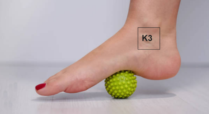 Place red connector pad over metatarsophalangeal joints of the affected foot and white wire lead pad at inner ankle point K3.